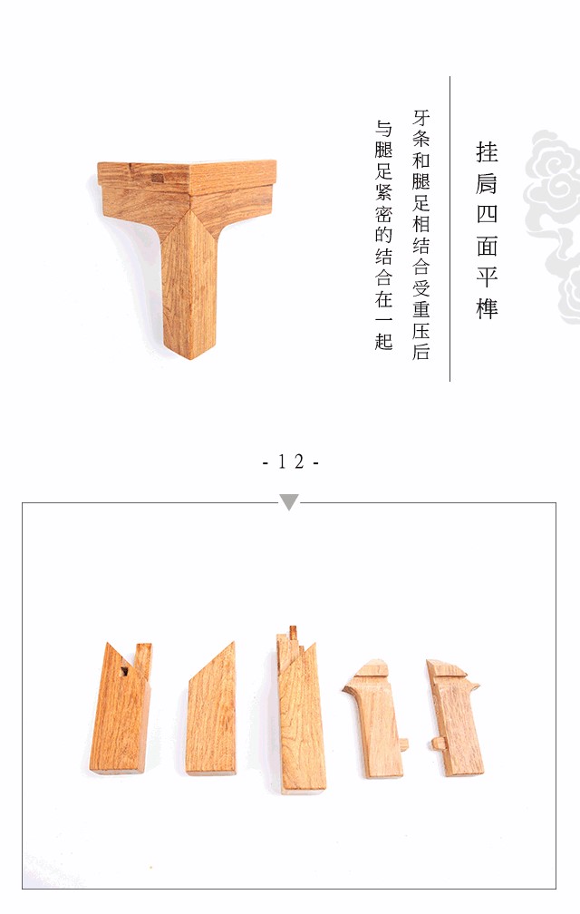 抱肩榫:抱肩榫是有束腰家具的腿足与束腰、牙条相结合时使用的榫卯结构。也可以说是家具水平部件和垂直部件相连接的榫卯结构。